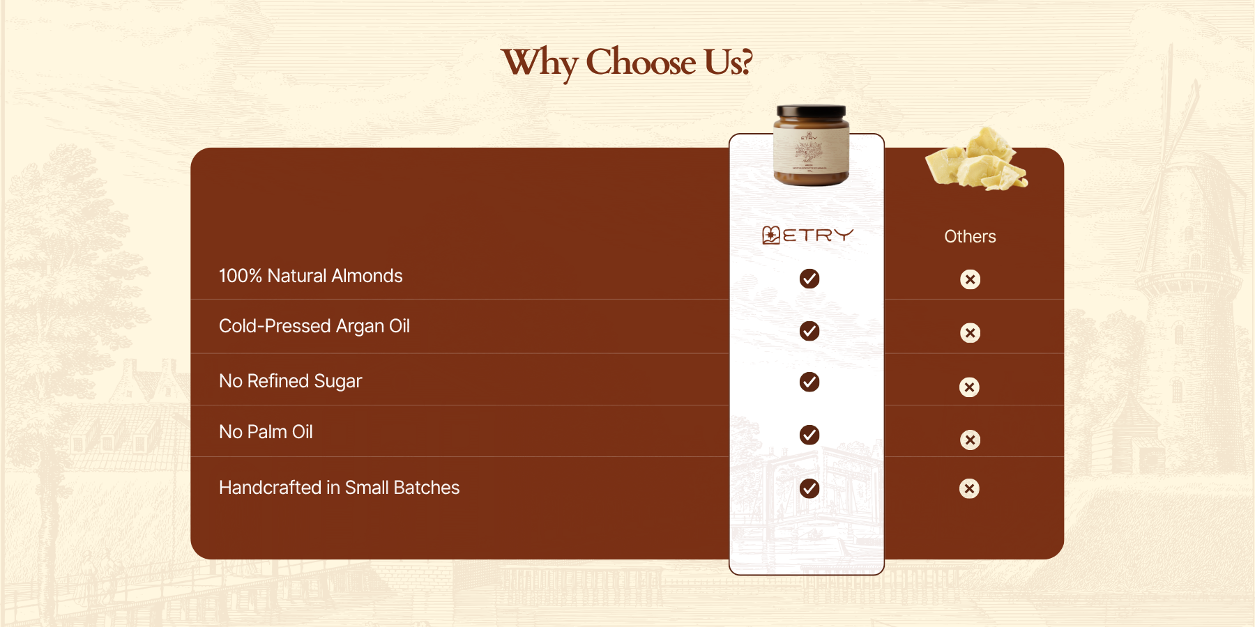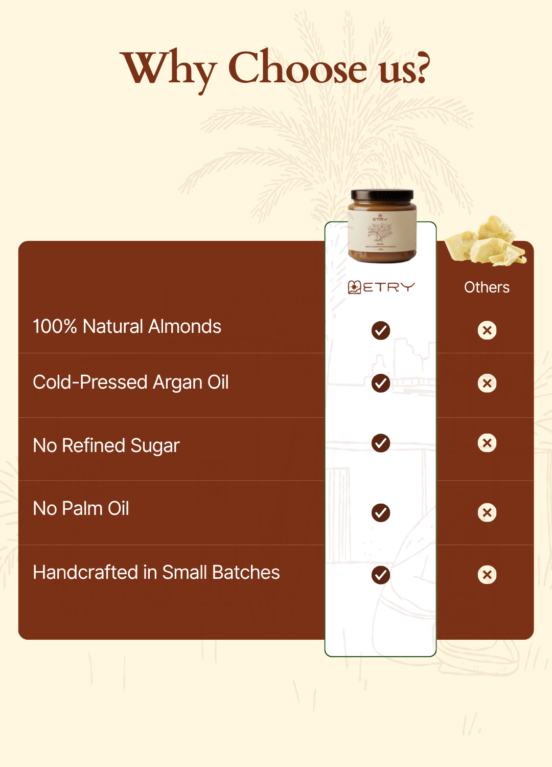 Etry’s Amlou captures the richness of Moroccan heritage in every spoonful creamy, pure, and irresistibly smooth. Handcrafted from roasted almonds and Argan Oil, it nourishes the body and honors the artistry of generations past.